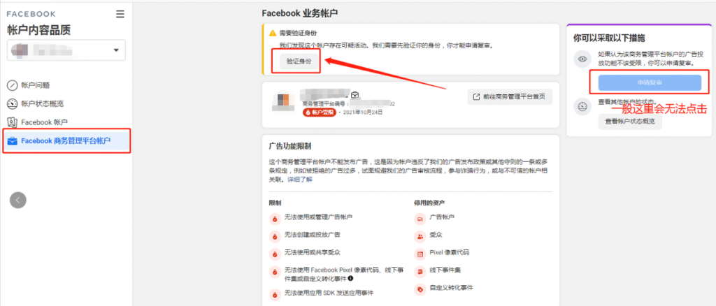 此界面,点击左侧栏“Facebook商务管理平台账户”,则显示受限的BM,界面右侧的“申请复审”一般会无法点击,需要先验证身份。