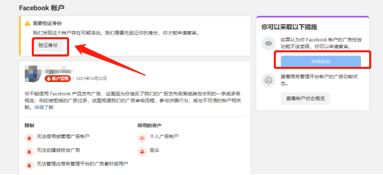 进入后,点击左侧“Facebook账户”会看到下面截图——同样的方法:验证身份-上传个人账号对应的身份证-等待Fb审核。